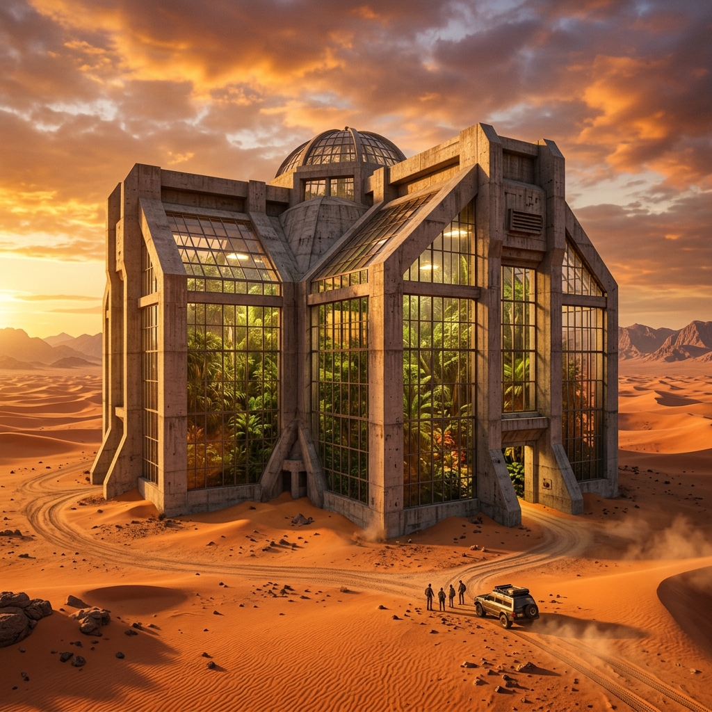 Photorealistic brutalist architecture, a massive abandoned concrete greenhouse in a vast orange desert, lush tropical jungle visible through giant glass panes, cinematic sunset lighting, hyper-detailed, 8k --ar 16:9 --v 6.1