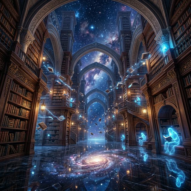 Library reaching into the stars with floating books and blue spirits.