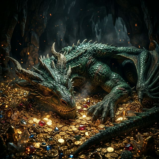 Hyper-realistic cinematic of a sleeping dragon on a mountain of gold.