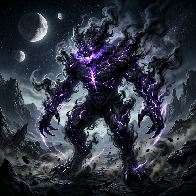 A dark, terrifying demon creature made of {{MATTER_TYPE}}, with glowing violet cracks in its skin. Standing in a desolate, alien wasteland with {{MOON_COUNT}} moons in the sky. Horror fantasy, eerie atmosphere, sharp claws, hyper-detailed smoke effects. 8k, cinematic.✨ Launch Prompt